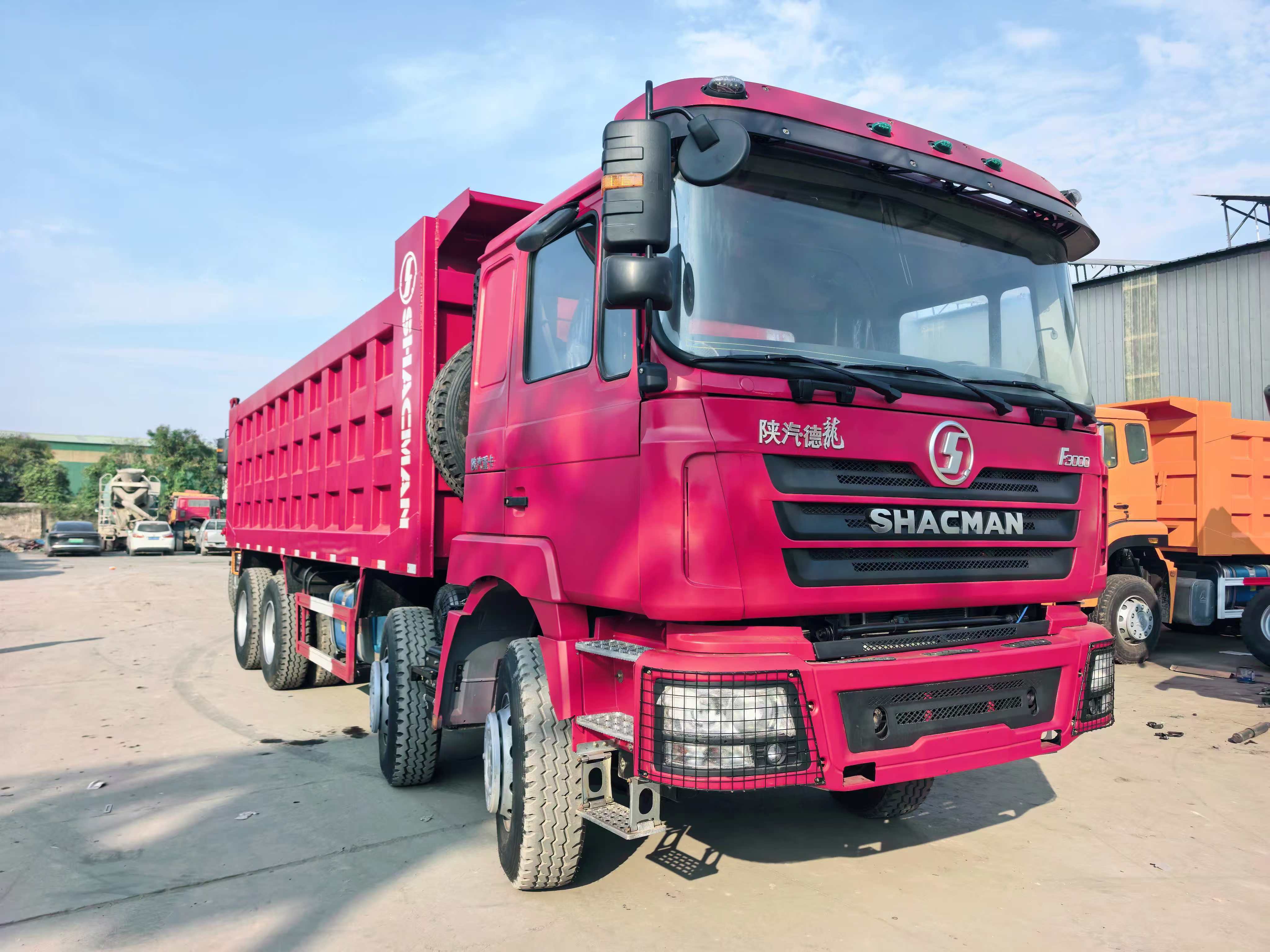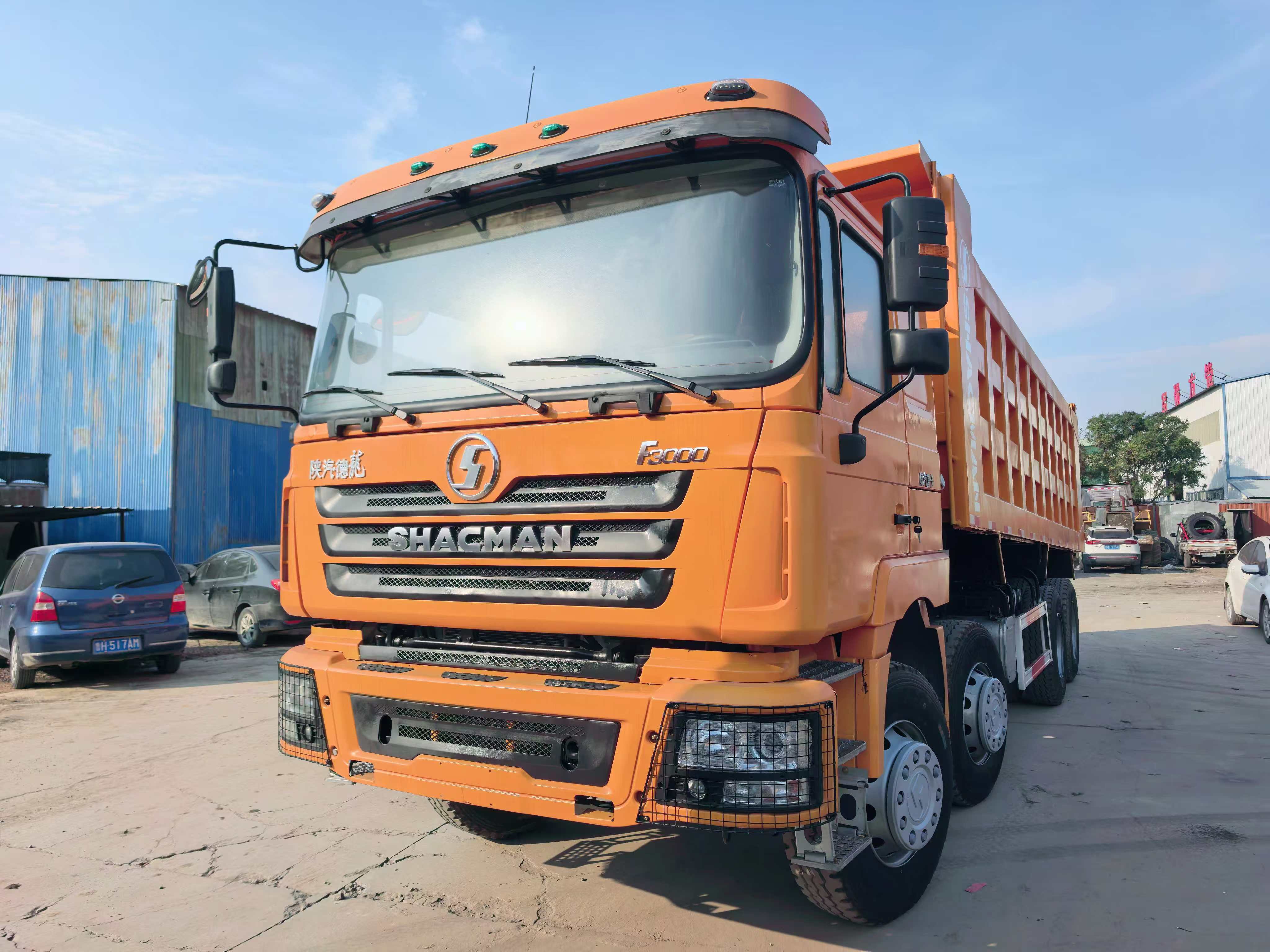 这是陕汽德龙F3000 8×4自卸车,属于重型工程货车,主要用于运输砂石、煤炭等散装物料,通过货箱后翻实现自动卸货,是工地、矿山常见的运输车辆。核心特点是“8×4”驱动形式(8个车轮、4个驱动轮),搭配大马力发