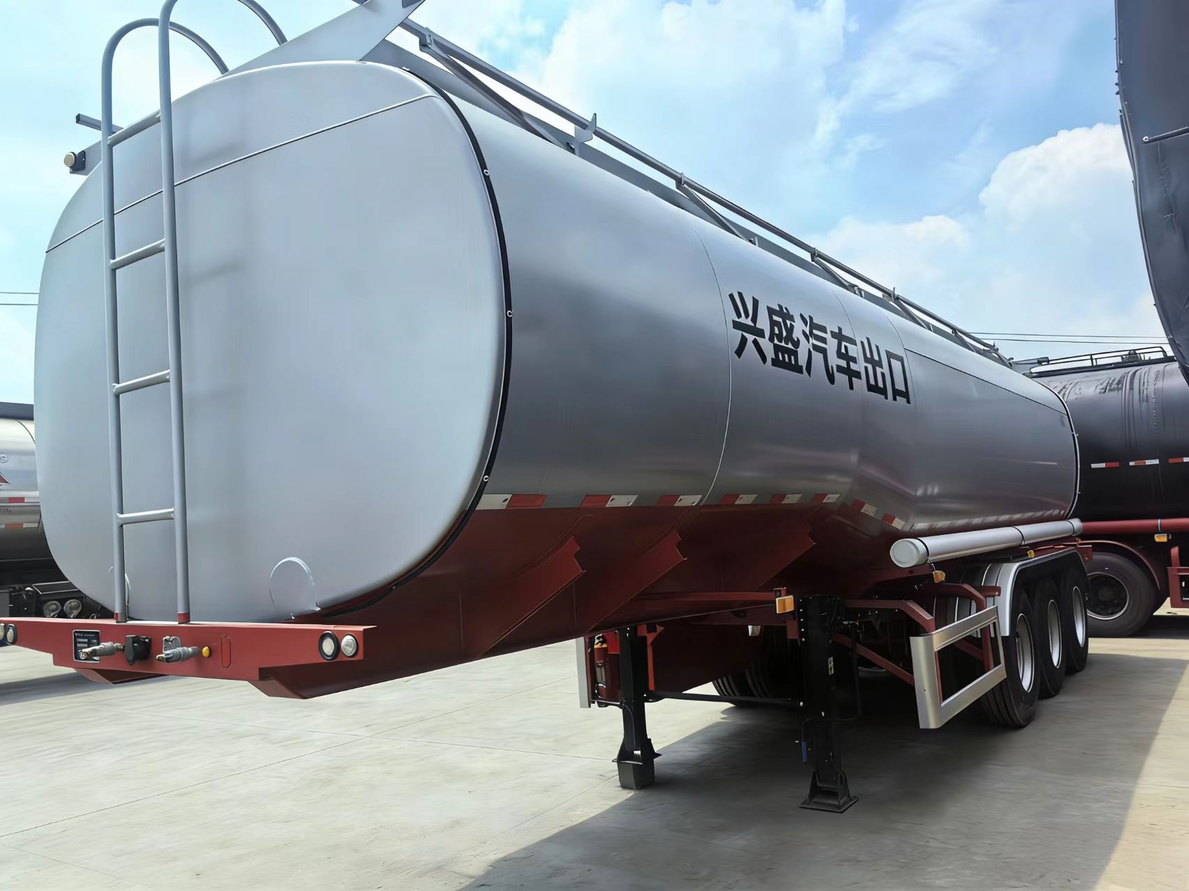 这是罐式运输半挂车(液体运输罐车),属于专门用于运输液态介质的重型货运挂车。核心信息1. 产品特性◦ 罐体:采用碳钢或不锈钢材质制作,图中罐体为银灰色涂装,标注有“兴盛汽车出口”字样,说明是用于出口的定
